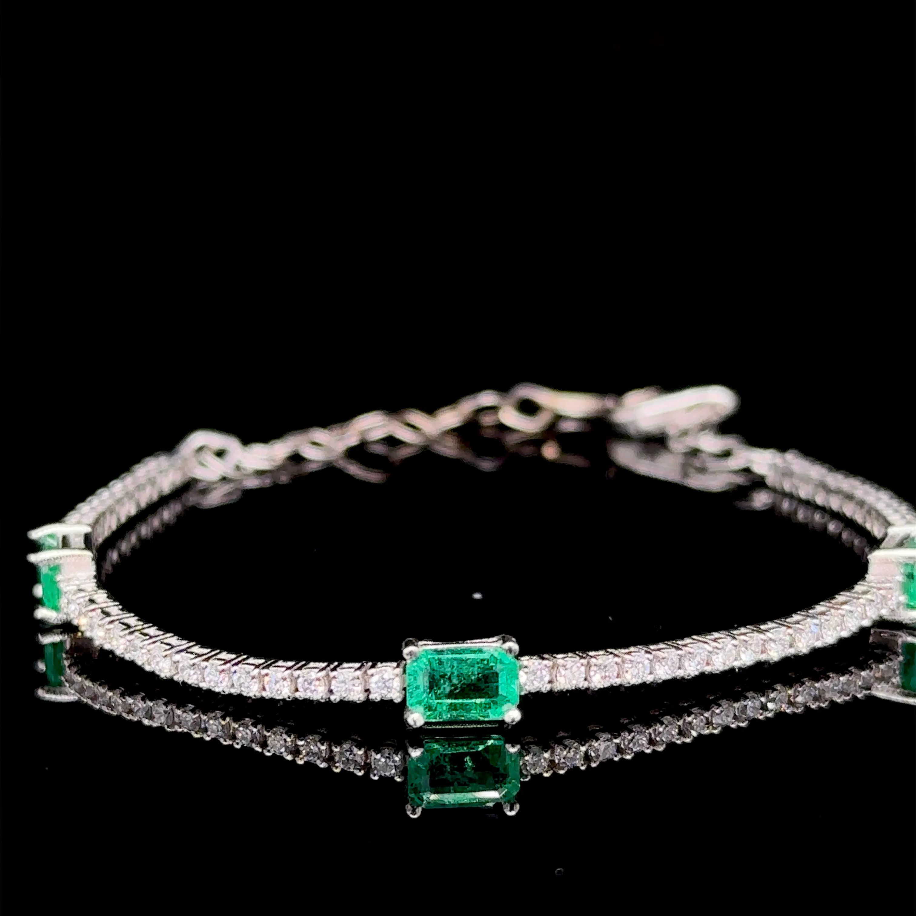 This bracelet showcases 3 emerald cut emeralds with a total weight of 1.50 carats, paired with 0.78 total carats of dazzling natural VS quality diamonds. An eye-catching blend of gems set in an elegant 14k white gold setting.